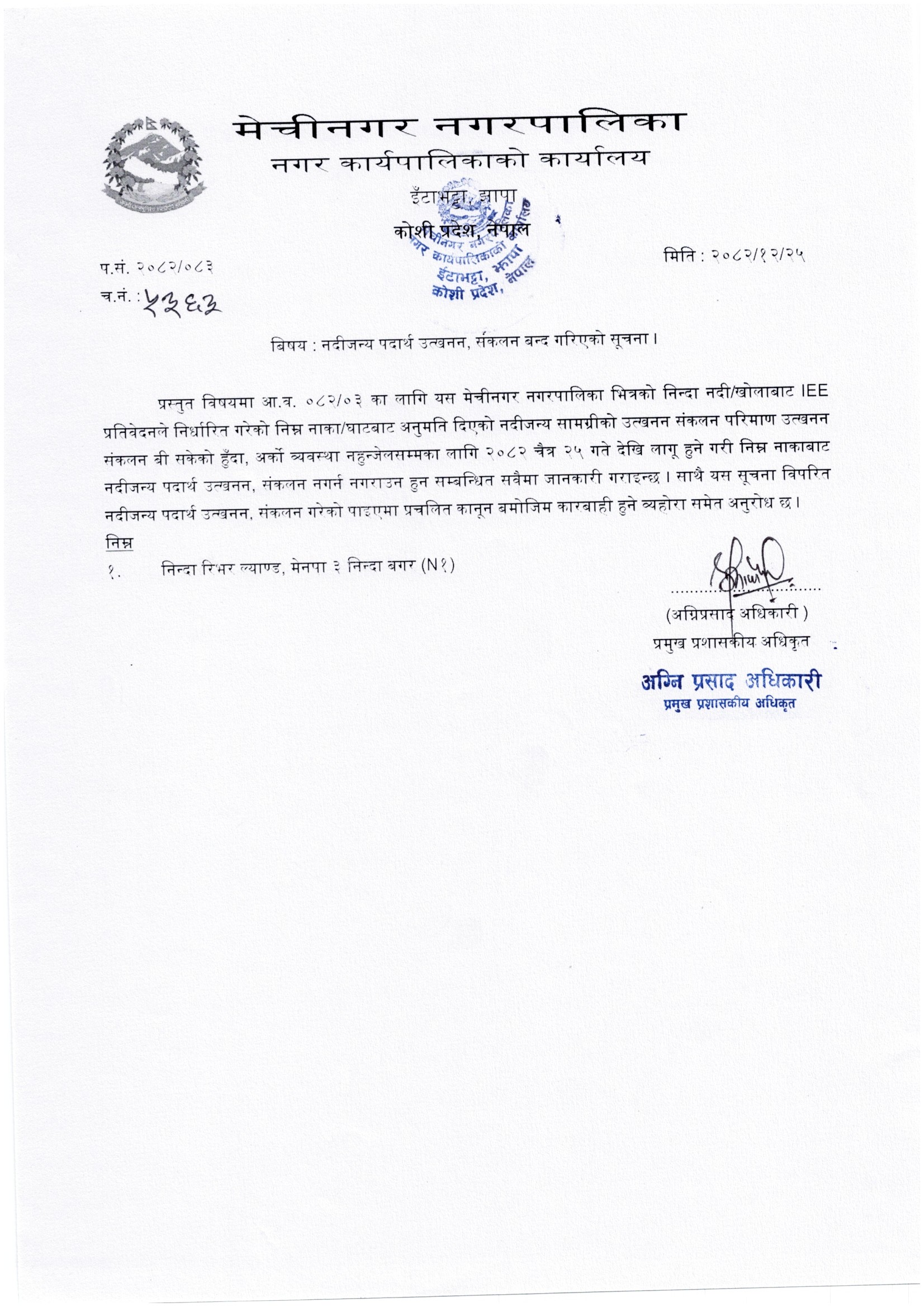 नदिजन्य पदार्थ उत्खनन संकलन बन्द गरिएको सूचना | मिति:२०८२/१२/२५