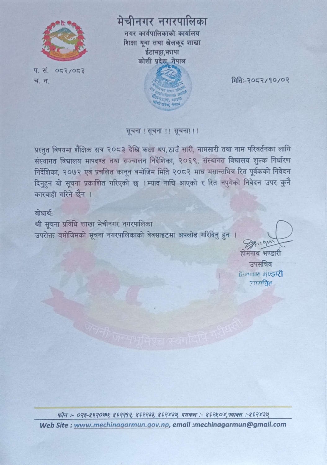 शैक्षिक सत्र २०८३ देखि कक्षा थप, ठाउँ सारी, नाम सारी तथा नाम परिवर्तनकोलागि निवेदन पेश गर्ने सूचना | मिति:२०८२/१०/०२