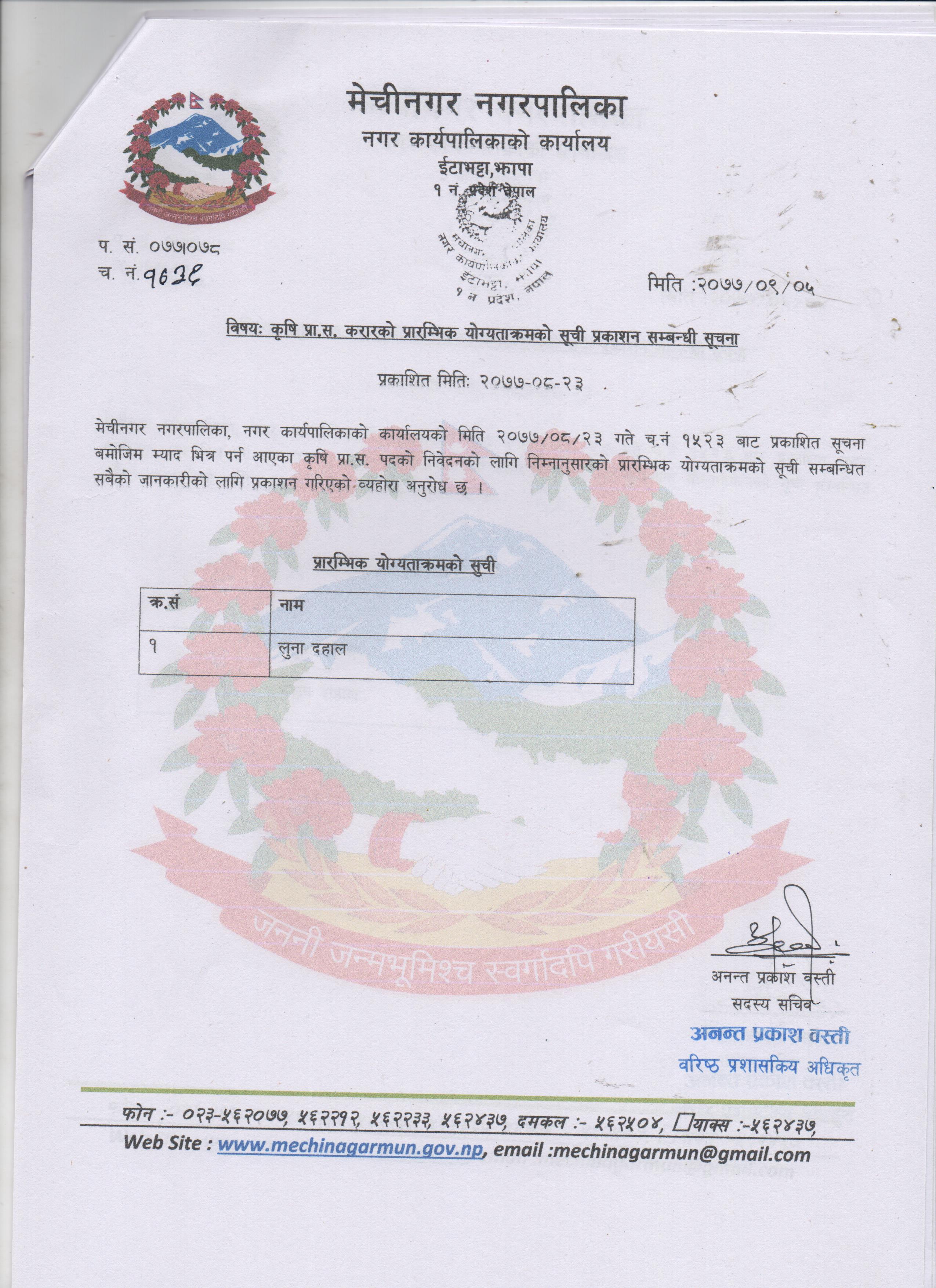 कृषि प्रा.स करारको प्रारम्भिक योग्यताक्रमको सुची प्रकाशन सम्बन्धि सूचना | मिति :२०७७/०९/०६