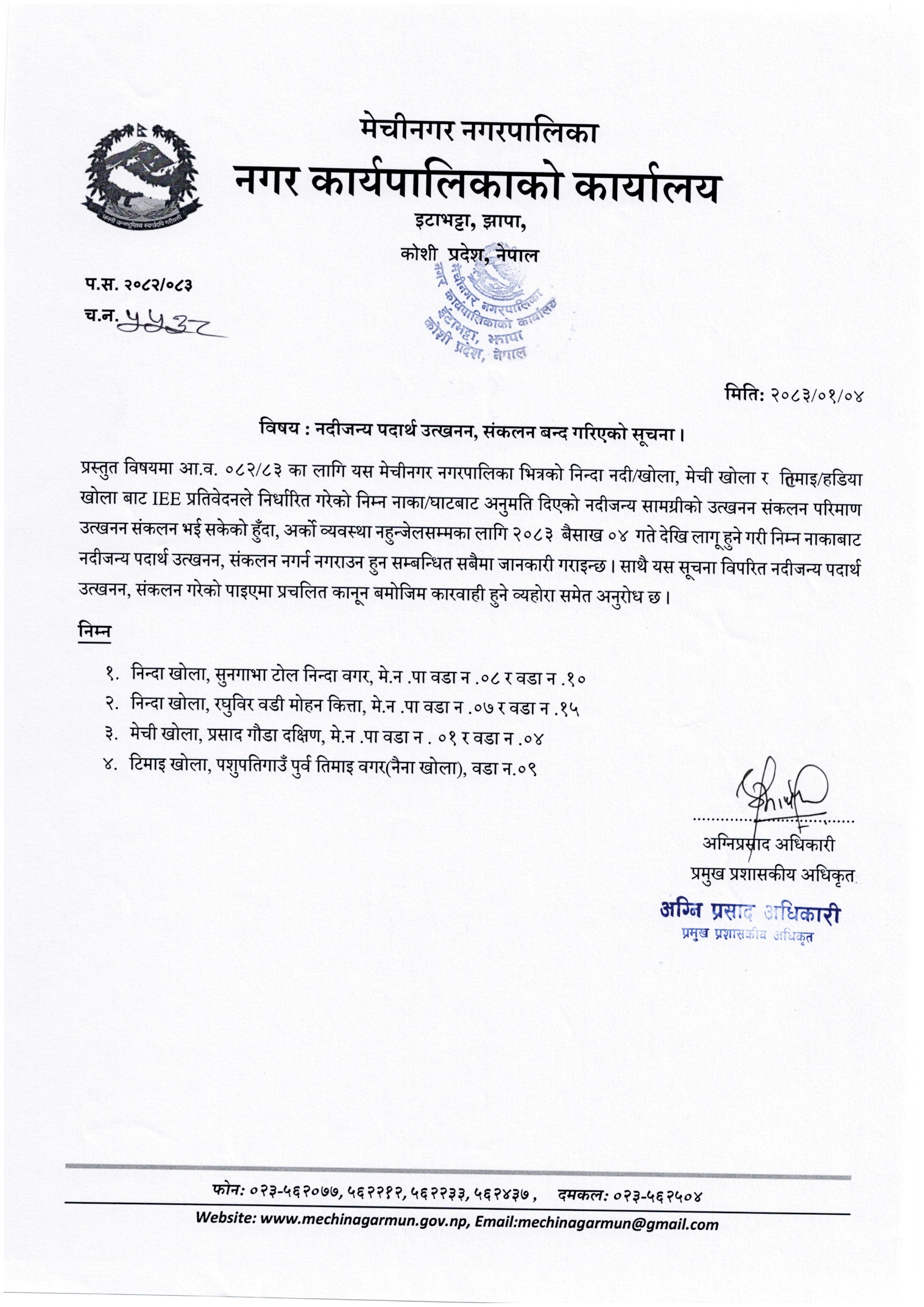 नदिजन्य पदार्थ उत्खनन, संकलन बन्द गरिएको सूचना | मिति: २०८३/०१/०४