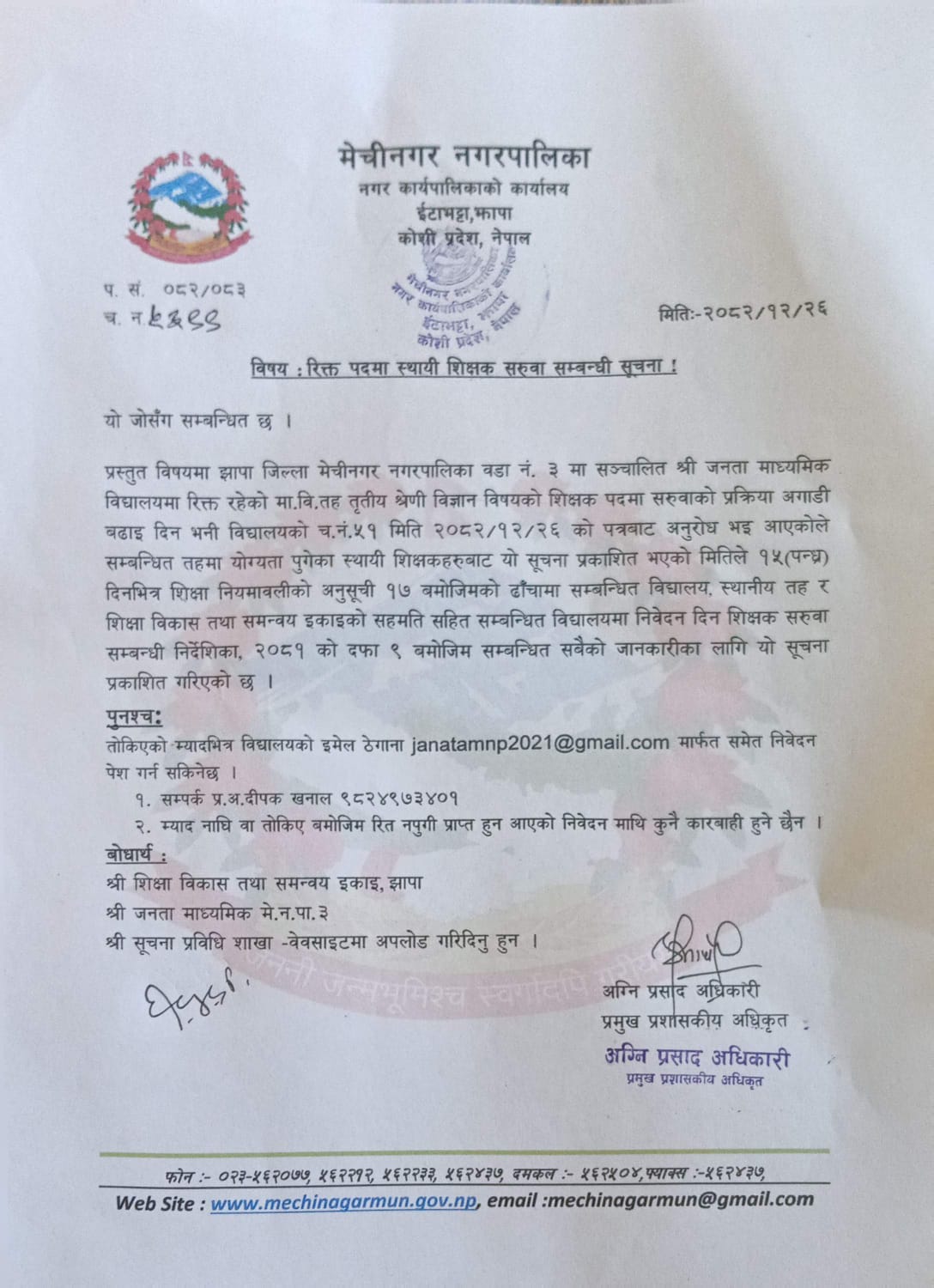 रिक्त पदमा स्थाई शिक्षक सरुवा सम्बन्धी सूचना | मिति:२०८२/१२/२६