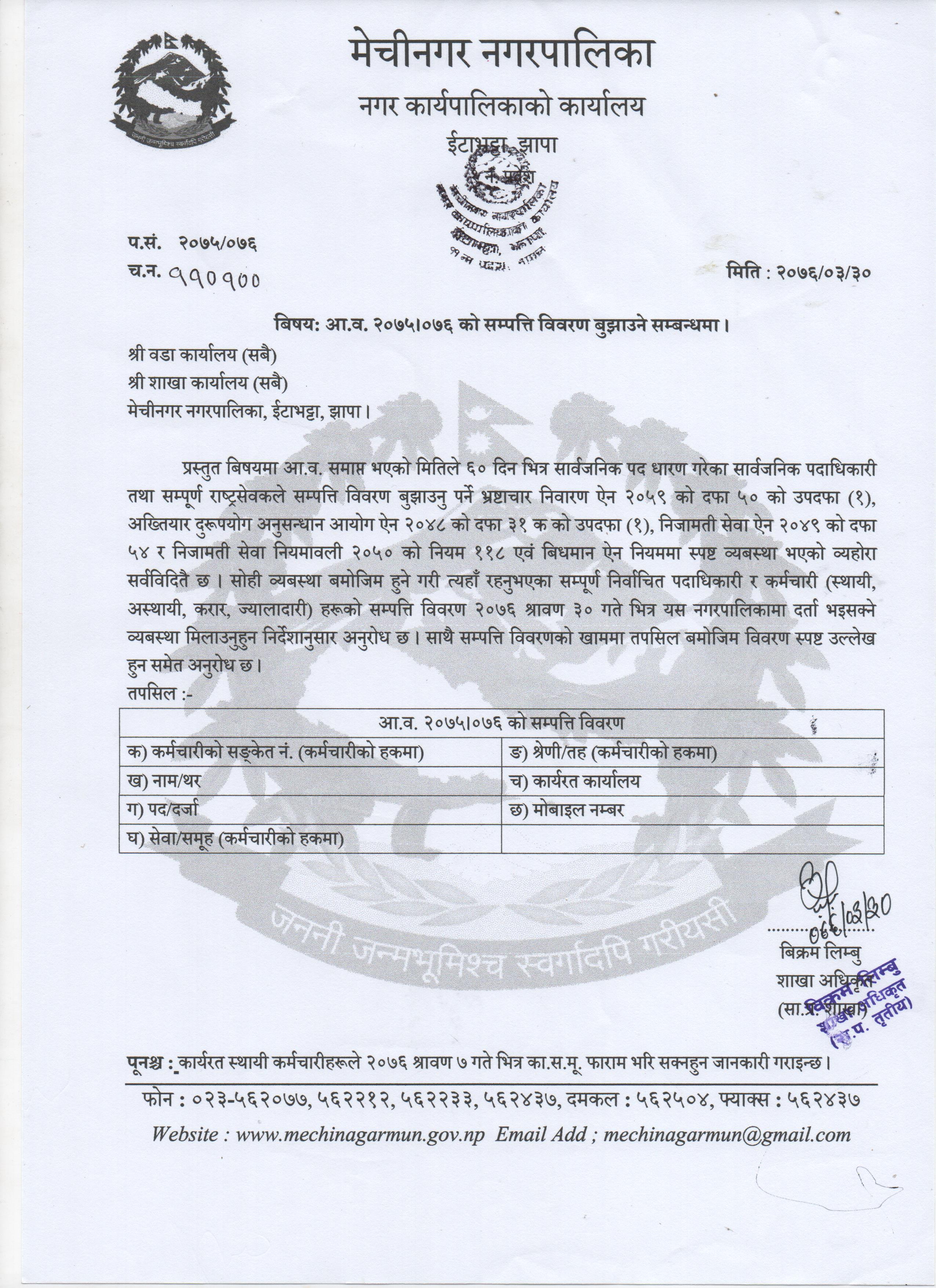 श्री वडा कार्यलय सबै, श्री शाखा सबै -->आ. व. २०७५/७६ को सम्पति विवरण बुझाउने सम्बन्धमा | मिति :२०७६/०३/३०