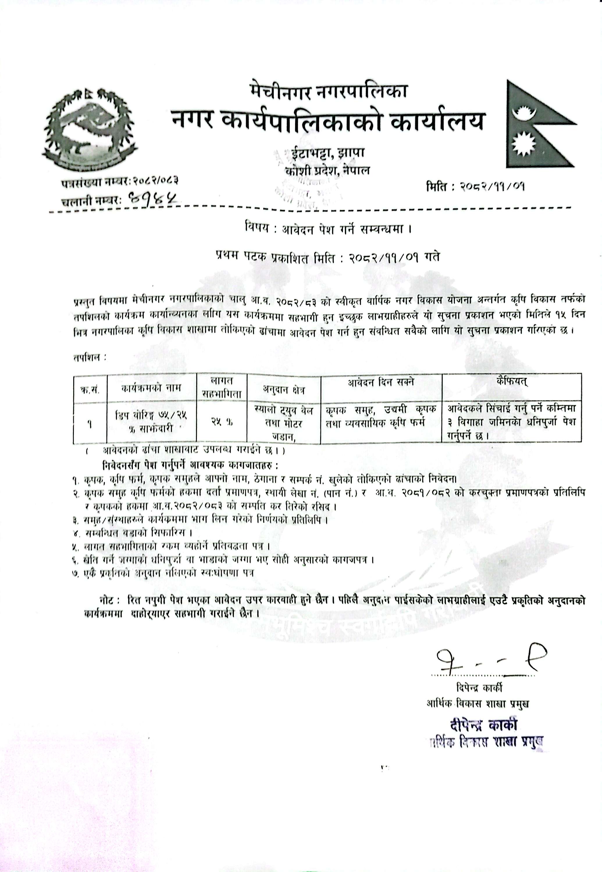 स्यालो ट्युबवेल तथा मोटर जडान (डिप बोरिंग) कार्यक्रमकोलागि आवेदन माग गरिएको सूचना | २०८२/११/०१