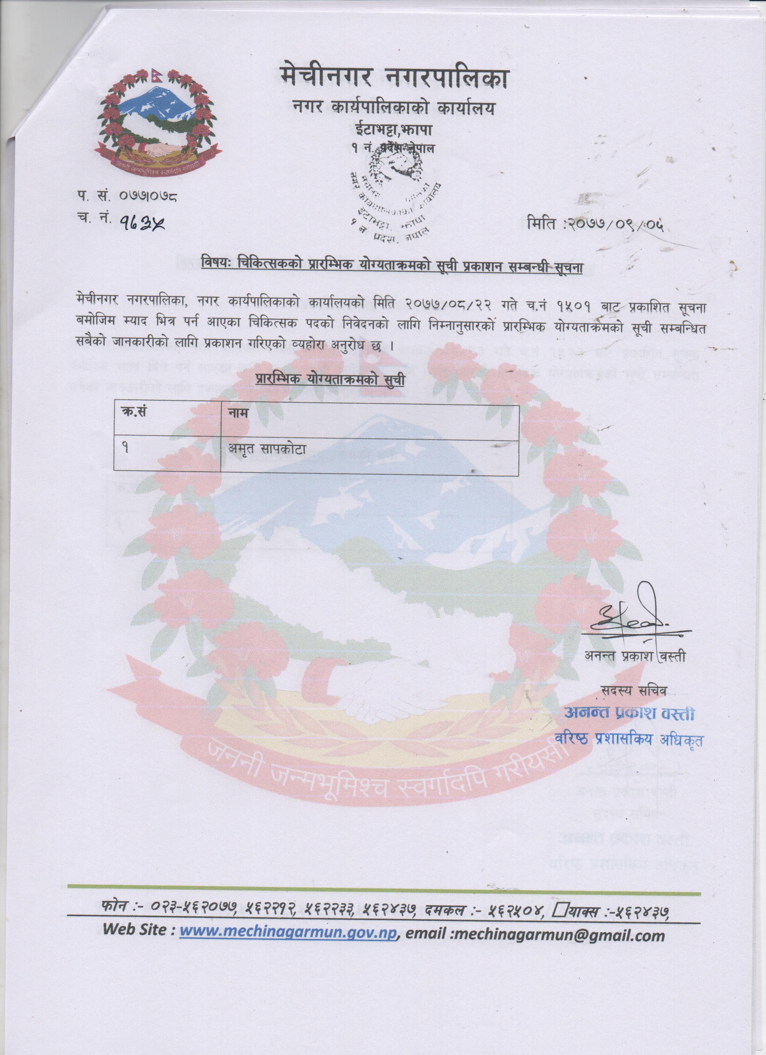 चिकित्सकको प्रारम्भिक योग्यताक्रमको सुची प्रकाशन सम्बन्धि सूचना | मिति :२०७७/०९/०६